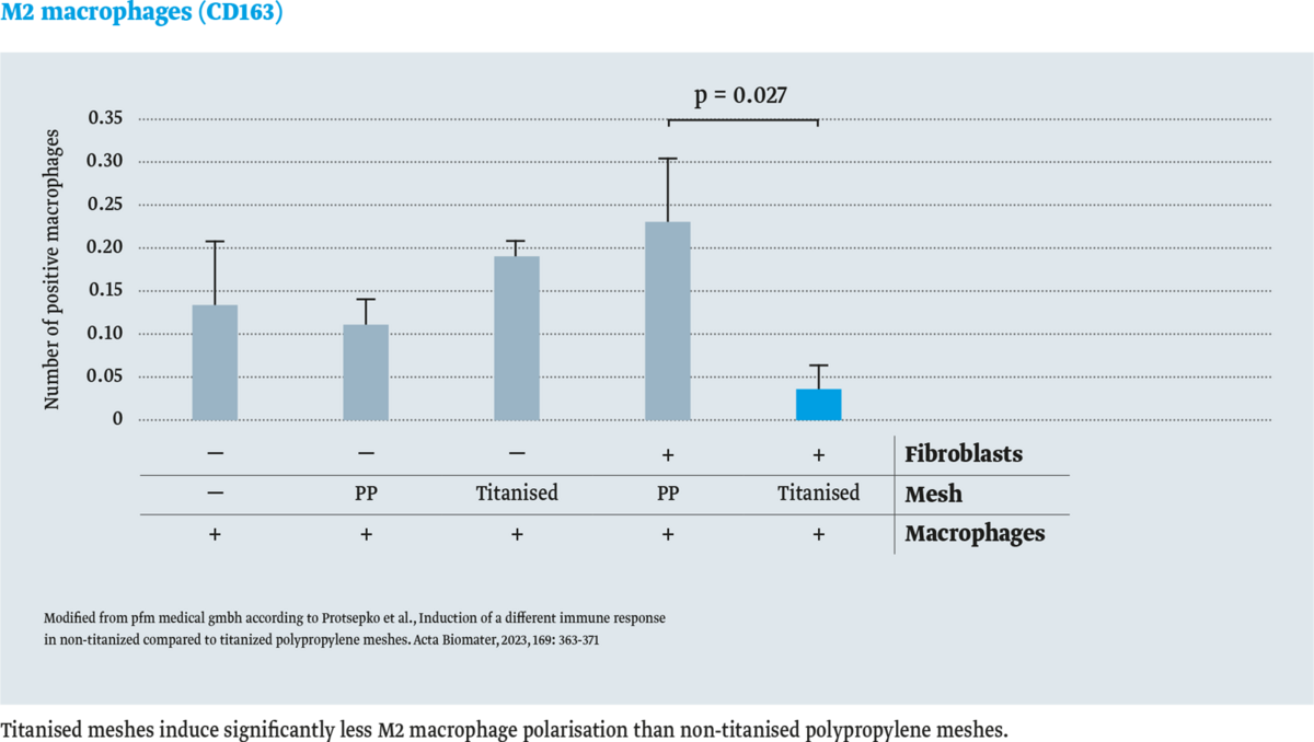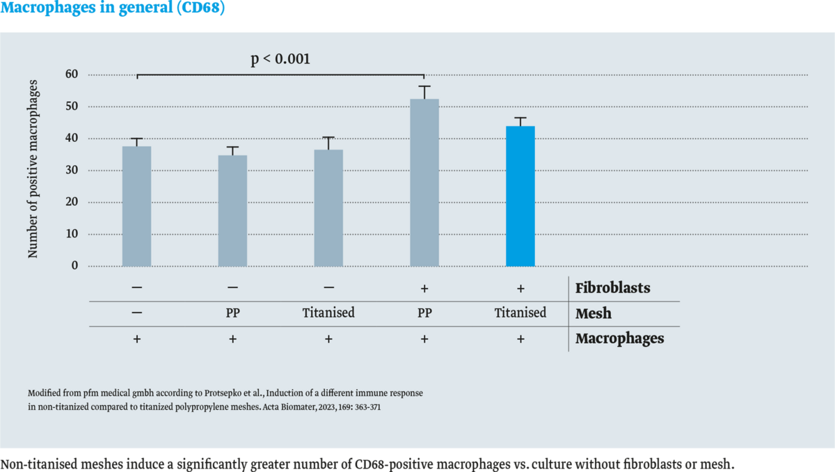 The immune response in titanised and non-titanised polypropylene (PP) meshes was compared. For this purpose,macrophages were cultured in vitro on the mesh material with and without fibroblasts. Immunohistochemistry was used to detect the following: